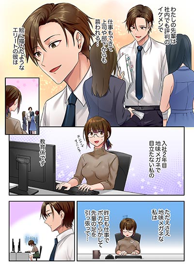 「そんなに欲しいなら、挿入れてあげる」―両足を広げられて私の割れ目を攻めてくる…そんなに焦らされたら私だって先輩のアレが欲しくなっちゃう…!会社でも地味な存在な遥香。教育係である先輩に誘われ、飲みに行くことになるが、飲みすぎてしまった彼女は先輩の家に…異性として見られていないことにショックを受けるが「せめて女としてみられたい」と秘密を打ち明け、先輩を誘惑することに…。遥香の秘密を知った先輩は彼女に自身の本性を見せ…