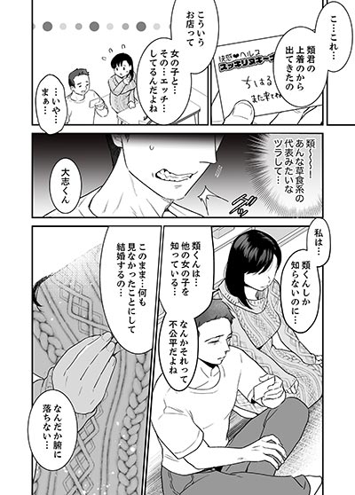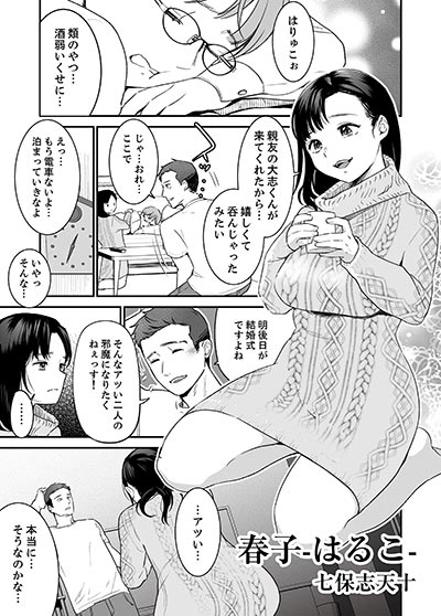 「私、いつもより…濡れちゃった…」――春子は一人の男しか知らなかった。そんな彼女は結婚式前日に旦那になる相手・類が風俗店に行っていたことを知ってしまう。「私は類くんしか知らないのに…類くんは他の女の子を知っているなんて不公平だよね…」そう思った春子は、結婚を祝いに来てくれた類の親友・大志を誘惑してしまう。酒に酔って先に眠る旦那の横で、春子は他の男を知り…女としての快楽に目覚めて―ー(春子-はるこ-/七保志天十)