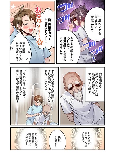 「そんなに触られたらイカされちゃう…ッ」――とある整体学校で講師を務める香園寺 礼(こうおんじ れい)。鬼講師と評される堅物女の香園寺は新入生・八坂草平(やさか そうへい)のマッサージ実技試験の試験官を務めることに。いざ試験開始!と思いきや、草平のマッサージは初っ端からダメダメ。採点不能な出来に呆れていると、だんだんと施術で触れられる場所が気持ちよくなってきて…!? 「次はわきの下からリンパを流しますね!」コリコリと乳首を揉みほぐされて、気が付くとぐしょ濡れの秘所。試験中なのに、カラダ中グリグリ連続で弄り回されたら…もう我慢できない…ッ 生徒のなのに欲しくなっちゃう――!!