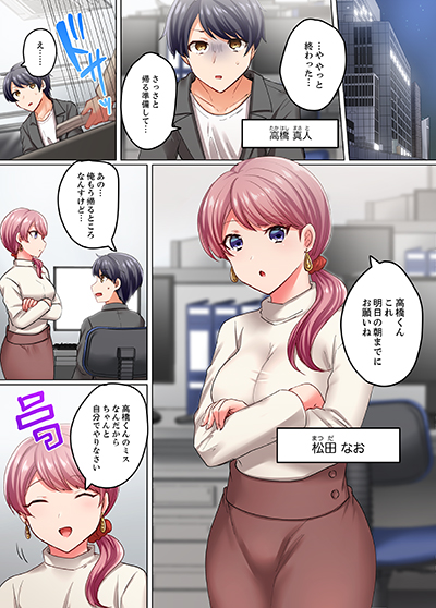 「何でもするから会社には言わないで……」ーーサラリーマンの高橋真人は女上司の松田なおから無茶な仕事を押し付けられ、毎日のように残業をこなす日々を過ごしていた。ある日の残業後、気晴らしに利用したSNSに裏垢女子からHなお誘いメッセージが!?騙されたと思いつつも待ち合わせ場所に向かってみると……約束の場所には、なおの姿が…!?裏垢のことを会社に言わないかわりに、日ごろの仕返しとしてHな要求を彼女に求める真人。強気な彼女が言われるがまま服を脱ぎ、オナニーをする光景にだんだん嗜虐心が煽られて、むき出しの秘部を指でかきまわし辱めを与えていく。イキ果てる彼女の姿に我慢ができなくなり……びしゃびしゃになったアソコにいきり立ったブツを押し当て、そのまま…!