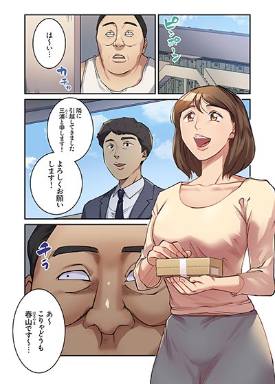 夫の転勤を機に、あるアパートに引っ越してきた新妻・直美。ある日、荷ほどきをしていると、昔、夫婦で使っていた愛用のバイブを見つけてしまう。セックスレスだった直美は我慢できず、バイブオナニーを始めようとしたその時、隣人・春山の部屋から大きな物音と助けを呼ぶ声が。直美はそのまま春山の部屋へ向かってしまう。自身がノーパンであることを忘れて…。無防備過ぎる直美の姿に興奮した春山は直美の尻を掴み、豊満なおっぱいを揉みしだき、オナニー中でグチョグチョに濡れたアソコまでも舐め尽くしていく…。ついには「奥さんのアソコ、これで蓋してあげますよ」と直美のアソコに巨大なイチモツあてがい…!?