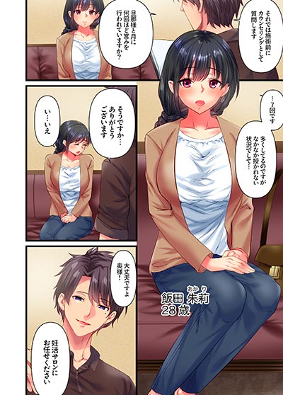 「お願い…主人には言わないで…っ」――夫との妊活に励むもなかなか子供を授かることができない主婦の朱莉は、藁をもすがる思いで【妊活サロン】なる店にきていた。施術を担当する風間は人当たりもよく、話も真摯に聞いてくれるため安心していたのもつかの間、着替えるように渡された服はほぼ下着の際どいモノだった…!? しかし子供を授かるため、あとに引くわけにもいかず、そのまま施術を受けることに…。指圧やオイルを使った施術は心地よかったものの段々とエスカレートしていき、ピンピンになった乳首やトロトロのアソコを触られイカされてしまう…。これで終わりかと思いきや、風間は「本当の絶頂、知りたくないんですか?」と夫のよりも大きく太いアレを見せつけてきて…!?