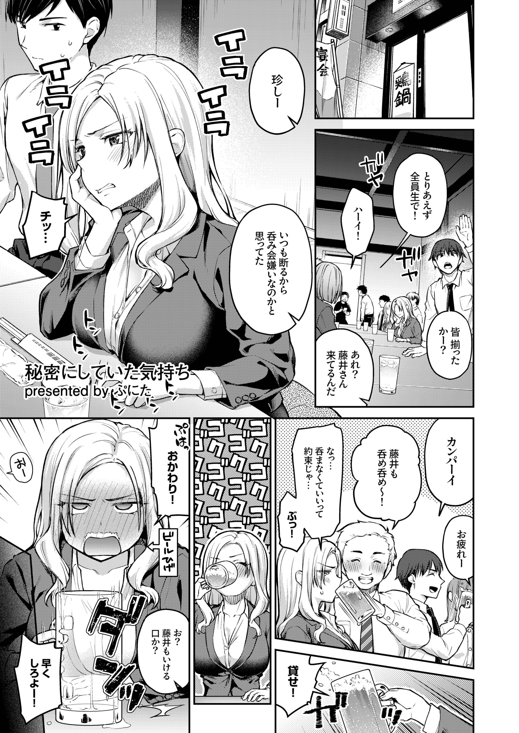 「前から好きだったんだし…」――いつもは不愛想だが、珍しく会社の飲み会に参加している藤井さん。ハイペースで飲み始めたと思ったら、案の定へべれけになってしまう… なんとか家まで送り届けた主人公だったが、夢か何かと勘違いした藤井さんはそのまま主人公にキスをしてくる… そんなことされたらいつも見ていた豊満でふわふわのおっぱいにむしゃぶりつくしかないだろ…っ(秘密にしていた気持ち/ぷにた)OL、幼馴染、先輩など、多種多様なヒロインたちの酔いどれ痴態が見放題な贅沢アンソロジー。
