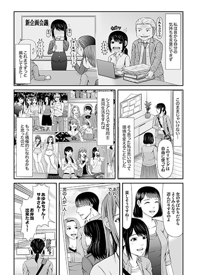 仕事に追われ、自分の気持ちを言葉にできないまま毎日を過ごしていたOL・雪乃。そんな自分を変えたくて引っ越したのは、女性限定シェアハウス。しかし、そこには唯一の男性である管理人・郁哉がいた。始めは不安に思う雪乃だったが、郁哉の穏やかな笑顔、低く落ち着いた声に安心を感じ始める。そして雪乃は「我慢しないで。もっと、自分を解放して」と言われてそのまま身をゆだねてしまい…‥!乳首を摘まれ、舌でなぞられ、全身が熱に包まれていく。長くて太い指が奥まで侵入し、クリ●リスを舌で転がされると「だめっ、そこ…もう無理っ!」と声を漏らす――。快感の波に飲み込まれ、何度も絶頂を繰り返す……ここは、悩める女たちが快感で変わっていくシェアハウス。
