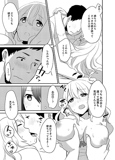 ぷっくり勃った乳首を吸い上げ、パンツのスキ間からぬるぬるのワレメに指を差し込むと…「誰がそこまで…っ、あぁんっ!」。敏感すぎる双葉と、マシュマロおっぱいのひとみ…こんな同居生活、童貞の俺にはヤバすぎる!