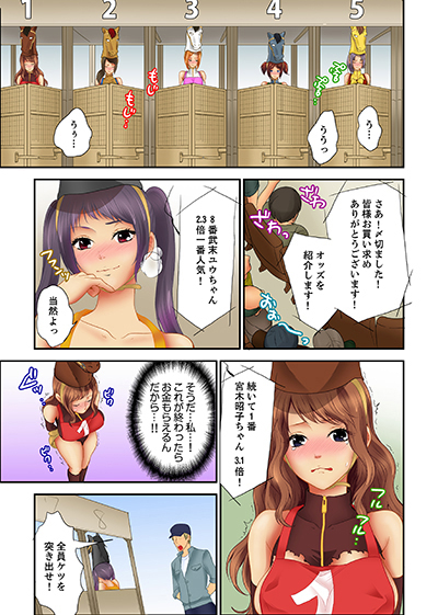 ――借金がある昭子。ある日、とある筋から金が稼げるレースがあることを聞き、出場することに。しかしそれがトンデモない裏レースで…!?なんと、女が馬のカブり物をして牝馬と化し、騎手(男)が騎乗して、ズッコンバッタン激しく突きまくられゴールを目指す!大勢の観客の見ている中、乳首とク●をイジられ舐められ…馬の尻尾(バイブ)を●●にブチ込まれ…もう何度もイカされ失神寸前!はたして、 昭子は優勝することができるのか!?